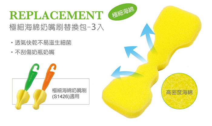 ●產品特色 1.嚴選極細高密度海綿,透氣快乾,不易滋生細菌,不刮傷奶瓶奶嘴 。 2.經高溫處理,比一般海綿耐用,且材質柔韌能將奶嘴或奶瓶較小配件細微處清洗乾淨。 ●產品材質 海綿:高密度聚脂泡綿 SPONGE
